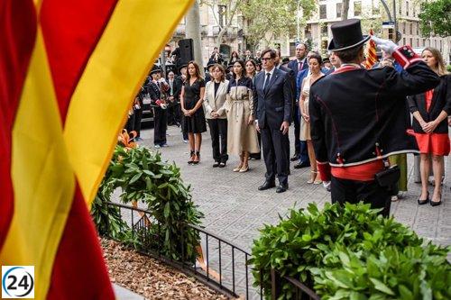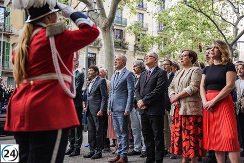La 'senyera' ondea en el Parlament con Illa, Collboni y Rull, marcando el inicio de la Diada.